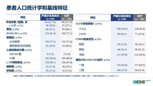 其次,研究人群选择与分层设计高度贴近真实世界。本研究入组100%为经 EGFR-TKI 治疗失败的非鳞NSCLC患者,95%的患者为三代经治,完全聚焦临床最迫切的未满足需求。同时,预设分层因素充分考虑患者异质性,包括“既往TKI 类型”和“基线脑转移状态”,试验组与对照组患者基线均衡,极大提升了结果的可靠性。