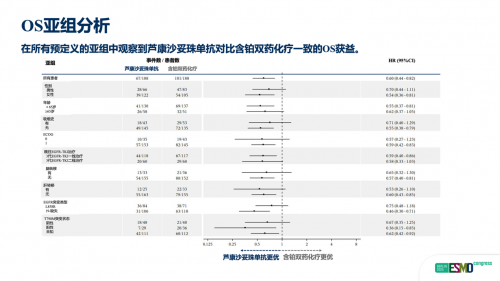 邬麟教授:OptiTROP-Lung04 研究在整体人群中已证实芦康沙妥珠单抗显著延长PFS(8.3 个月 vs 4.3个月;HR=0.49)并带来明确显著OS获益(HR=0.60;P=0.001), 尽管目前mOS尚未达到,但是经过模型预测,mOS有望延长至27-30个月。尤为关键的是,这种获益在多个预设亚组中高度一致,充分体现了其广泛的普适性。