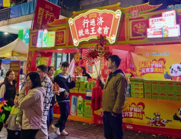 食品摊位则紧扣“行通济 冇闭翳”的民俗内涵,将王老吉经典饮品与节庆福利完美结合。王老吉绿盒凉茶作为经典王牌产品,传承百年草本配方,精选仙草、夏枯草、金银花等天然草本原料,清热降火、舒缓燥热,完美契合“怕上火喝王老吉”的核心定位——元宵佳节,市民逛民俗、品美食、聚亲友,难免出现口干舌燥、上火不适,一盒清甜爽口的王老吉凉茶,既能解渴润喉,更能快速缓解上火困扰。元宵也是走亲访友、传递祝福的好时节,“送礼就送王老吉”更是成为节庆送礼的优选。